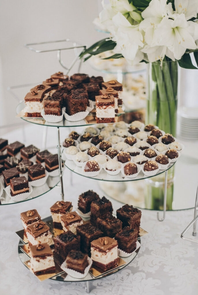 Use tiered stands to stack your desserts and instantly create a full, eye-catching display. Mixing heights adds dimension, makes everything easier to see, and gives your table that professionally styled look without needing more space.