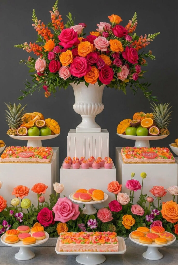 Don’t be afraid to go big with your floral arrangements—bright, full bouquets instantly turn your dessert table into a focal point. Bold colors add energy, create contrast, and make the entire setup feel vibrant, styled, and completely unforgettable.
