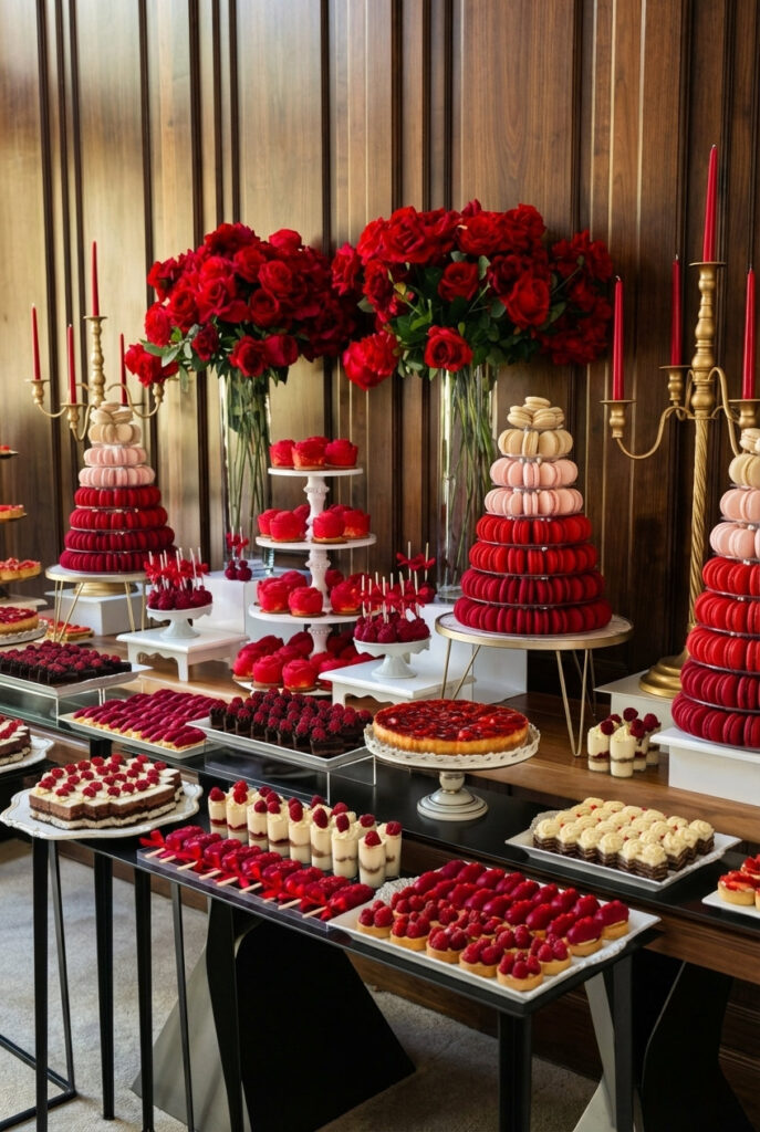 Lean into rich, dramatic colors like deep reds paired with soft neutrals to create a luxurious, romantic vibe. Coordinating your desserts, florals, and decor in the same palette makes the entire table feel cohesive, elevated, and incredibly eye-catching.