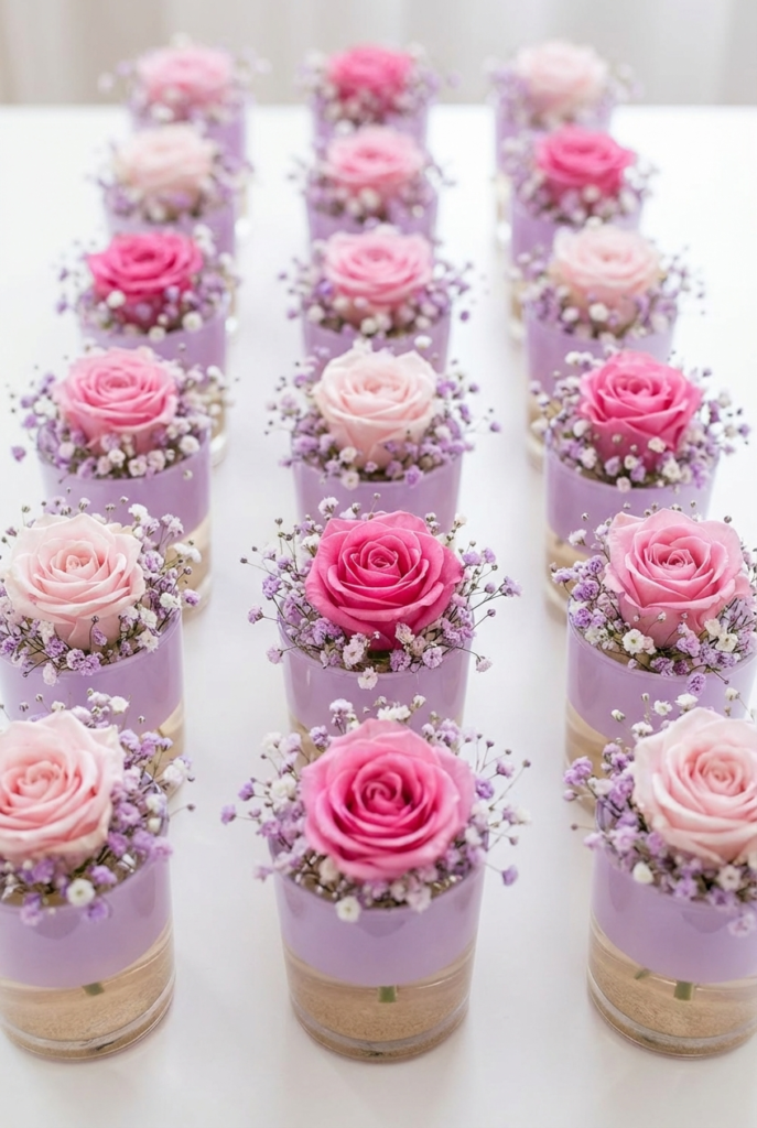 Arranged together, the cups create a stunning display that feels elegant, fresh, and effortlessly luxurious. They’re an ideal choice for couples who want bite-sized desserts that double as décor, bringing a soft garden-inspired touch to the dessert table.