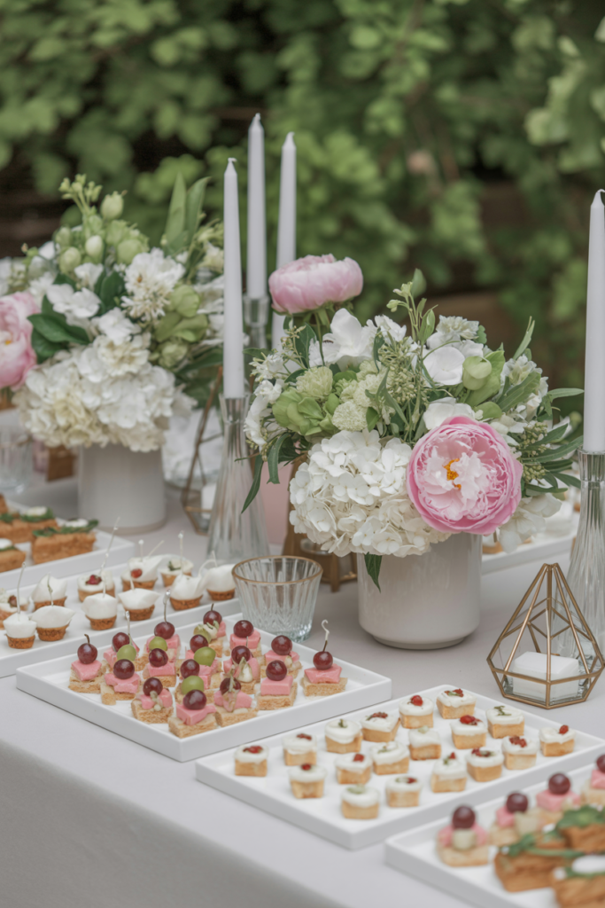 A lush centerpiece of fresh garden flowers adds height and color, tying the entire display together with soft pinks, creams, and greenery. This relaxed yet beautiful setup fits perfectly with the charm of a countryside celebration and works wonderfully for couples planning intimate backyard wedding ideas that feel warm, personal, and effortlessly romantic.