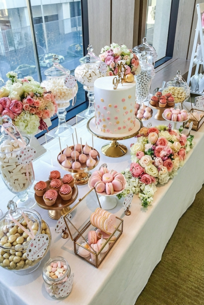 This romantic dessert table leans into soft blush tones and delicate floral details, creating a display that feels both elegant and inviting. A floral-adorned cake sits at the center, surrounded by pastel cupcakes, cake pops, cookies, and bite-sized sweets arranged on glass stands and gold trays. The gentle pink palette gives the entire table a light, airy feel that works beautifully for a romantic celebration.