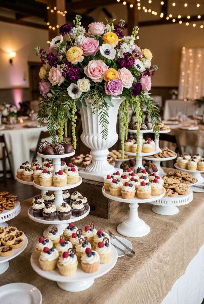 This barn wedding dessert table blends rustic textures with romantic floral details for a warm and inviting display. Wooden tables layered with burlap runners create a cozy countryside foundation, while elegant cake stands hold cupcakes, pastries, and bite-sized desserts topped with berries and whipped frosting. The mix of sweets gives the table a full, abundant look that encourages guests to wander over for a treat.