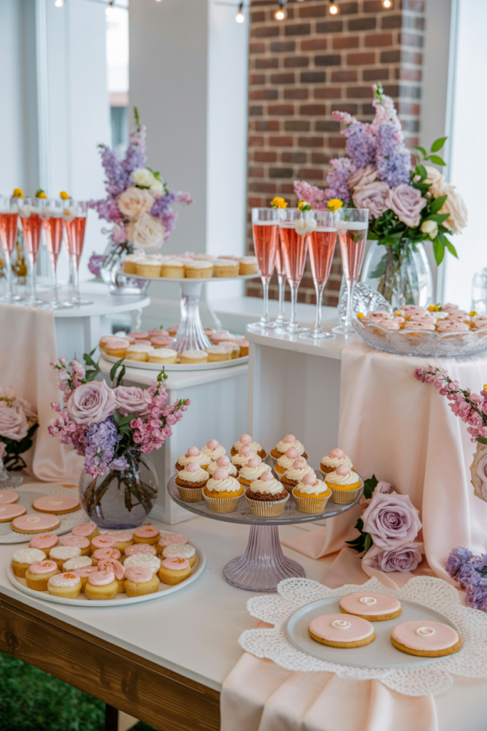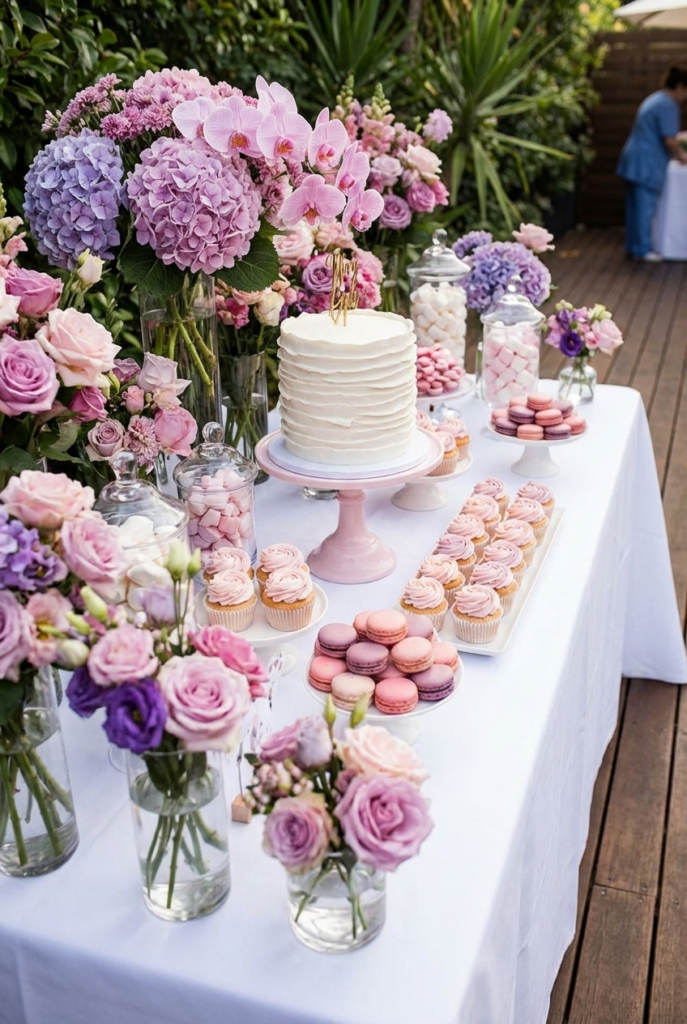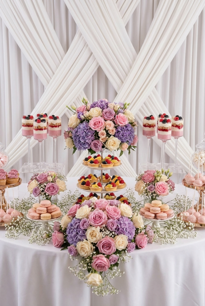 This elegant dessert table feels effortlessly romantic with its soft draped backdrop and pastel floral arrangements. Delicate desserts are arranged on clear acrylic risers, allowing colorful fruit tarts, mousse cups, and layered sweets to take center stage. A beautifully decorated cake sits to the side, framed by lush bouquets in shades of blush, lavender, and cream.