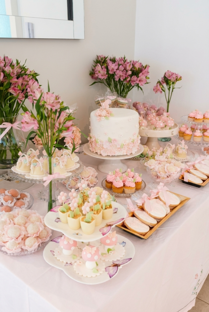 Fresh pink flowers in simple vases bring the whole setup to life, echoing the floral decorations on the desserts themselves. The mix of textures—from smooth fondant to piped buttercream and delicate sugar blossoms—creates a dessert table that feels thoughtfully styled while still warm and welcoming for guests.