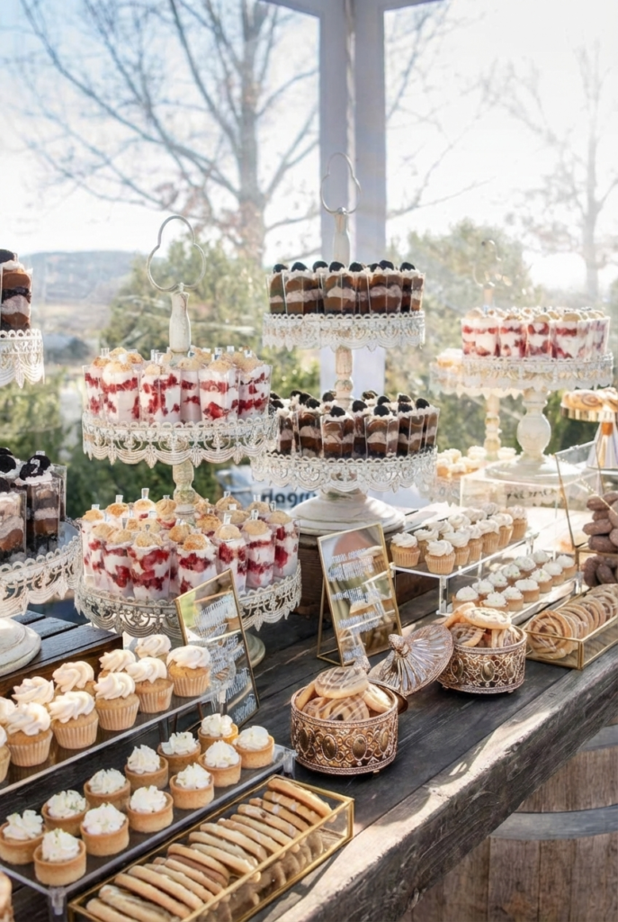 This romantic barn wedding dessert table pairs rustic charm with elegant detail. Wooden tables and countryside views create the perfect backdrop for ornate cake stands layered with mini parfaits, chocolate mousse cups, and fresh strawberry desserts. The tiered displays add height and texture while keeping everything easy for guests to grab and enjoy.