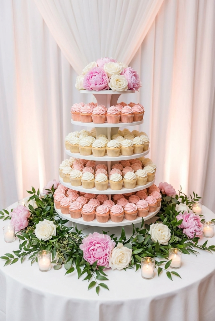 This elegant dessert display centers around a tall tiered cupcake stand filled with soft pink and vanilla frosted cupcakes. The layered presentation adds height and visual drama while keeping desserts easy for guests to grab and enjoy. Surrounding the stand with lush greenery, blush roses, and delicate peonies creates a romantic garden-inspired setting that feels effortlessly refined.