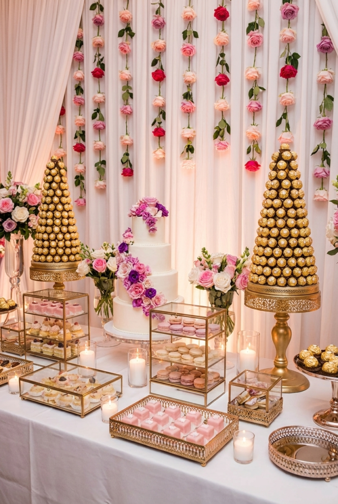 This luxurious dessert table pairs soft romantic florals with shimmering gold details for a truly show-stopping display. A classic white tiered cake adorned with fresh pink and purple blooms anchors the center, while towers of gold-wrapped chocolates create dramatic height on either side. The backdrop of cascading roses adds texture and romance, transforming the dessert table into a statement feature of the reception.