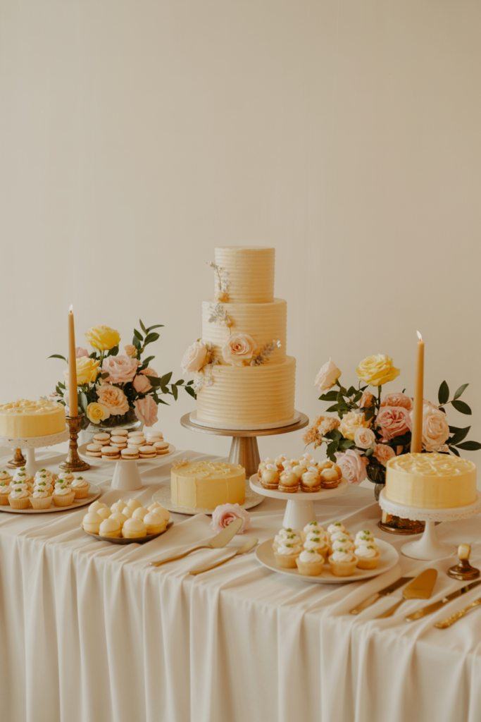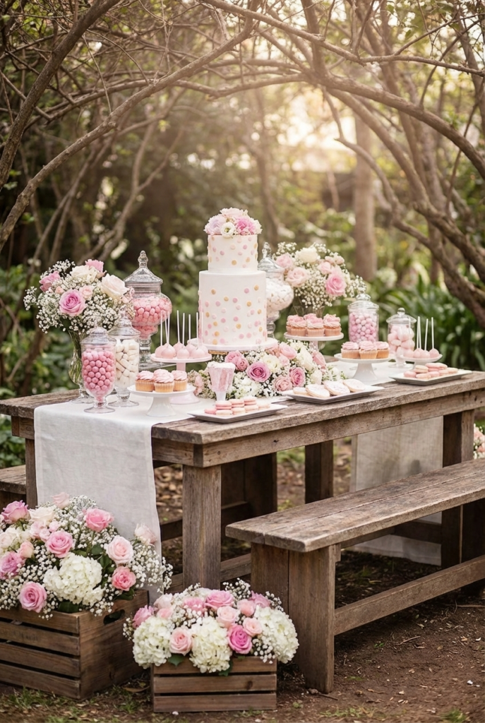 A thoughtfully styled dessert table fits perfectly into that setting, offering guests a beautiful spread of sweets that feel both elegant and delightfully rustic.