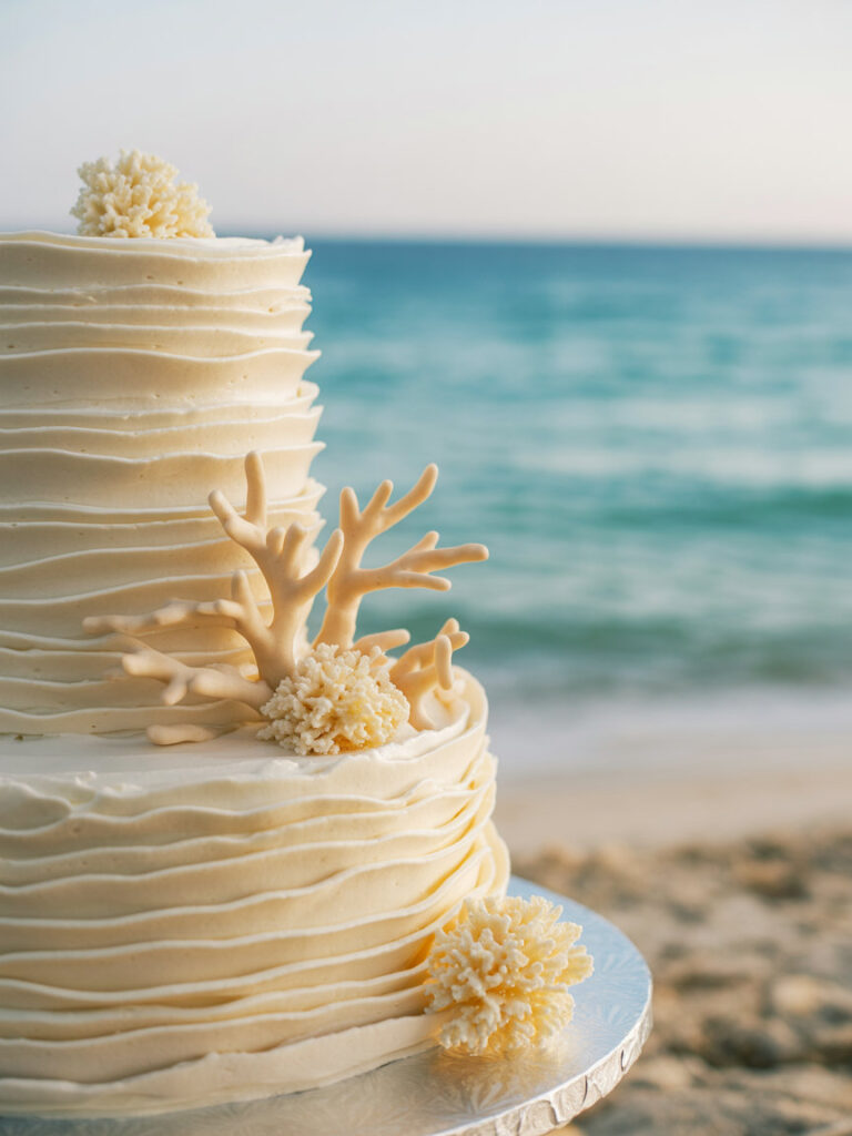 We’ve all seen it: every tier covered in shells, sand, coral, and a tiny sugar mermaid perched on top. Cute? Maybe. Refined? Not so much. The key to an elegant beach wedding cake design is restraint. Let one or two details — a gold shell accent, a watercolor wave, or soft ombré icing — carry the theme. Think coastal inspired, not “I glued an aquarium to my cake.”