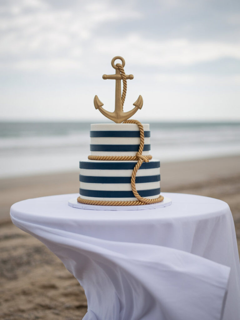 Ignoring logistics — transport, shade, setup time. The beach is unpredictable, and your cake deserves protection from wind and heat. Assign a bridesmaid or planner to check it once it’s set up.