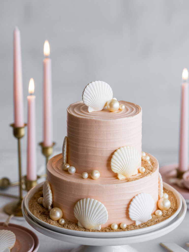 Height and presentation are everything. Add faux tiers, a tall stand, or decorative elements like palm leaves or shell garlands to make even a two-tier cake feel photo-ready.