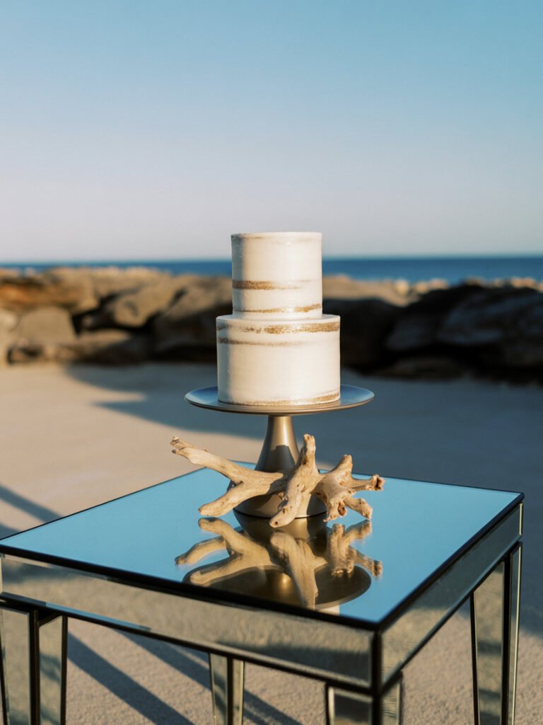 Here’s the thing about sand: it moves. And if your cake table isn’t properly supported, so will your cake. Use a flat, stable platform and keep your setup shaded whenever possible. If your baker offers delivery, take it — carrying a three-tier buttercream sculpture through a windy beach is the kind of stress no bride needs. A clear acrylic stand or mirror-top crystal base adds height while keeping everything steady and photogenic.
