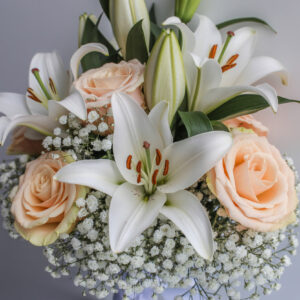 Peach gerbera daisies add a subtle pop of color and dimension, while the classic roses keep the arrangement grounded and refined. The balance between structured florals and more relaxed elements gives the bouquet that “perfectly imperfect” look that feels natural rather than overly styled.