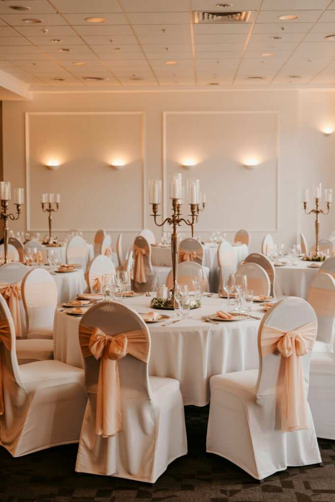 Round tables dressed in crisp white linens create a clean, classic foundation, while delicate peach napkins add just the right touch of warmth without overpowering the palette. It’s a look that feels elevated but still approachable—perfect for couples who want elegance without excess.