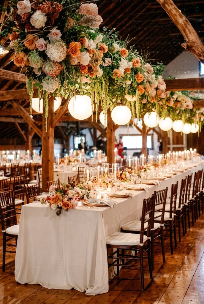 The real showstopper here is the overhead floral installation. Lush arrangements in shades of peach, ivory, and soft blush are suspended above the tables, layered with greenery that cascades effortlessly downward. It draws the eye up, fills the space beautifully, and makes the entire reception feel immersive rather than just decorated.