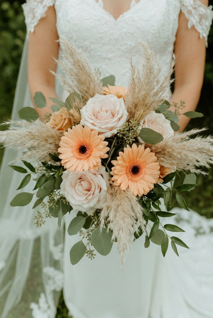 Pampas grass adds texture and movement, softening the entire design and giving it that airy, romantic finish. Paired with muted greenery, it balances the brighter peach tones beautifully while keeping everything grounded and cohesive.