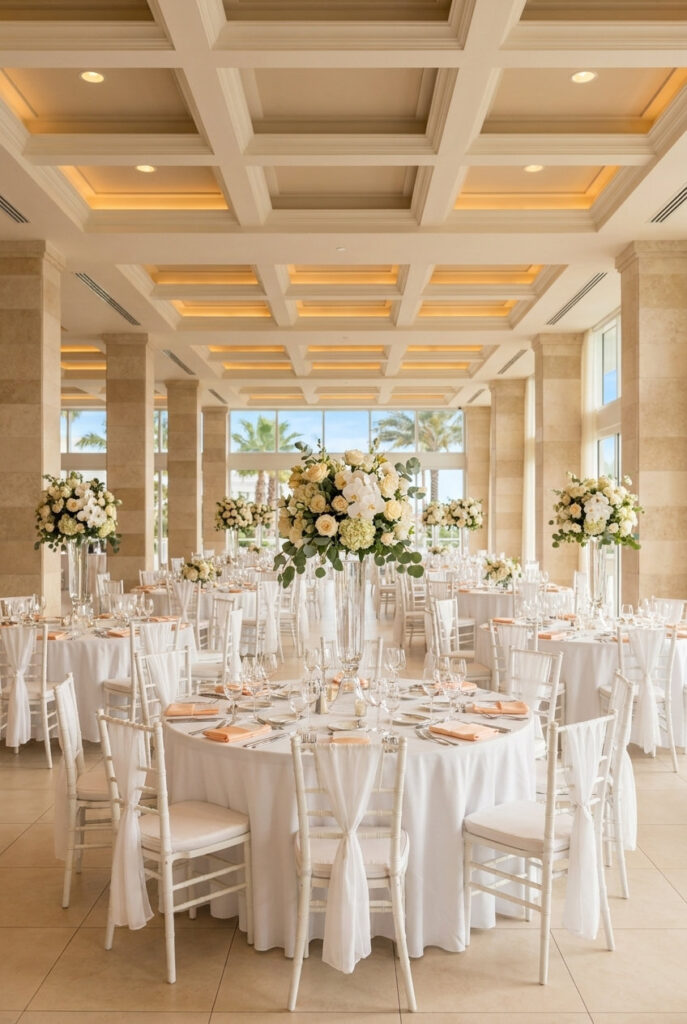 If you’re dreaming of a wedding that feels timeless, refined, and effortlessly romantic, this peach and ivory ballroom setup is exactly the kind of atmosphere that delivers. The space is bathed in warm, natural light, enhanced by soft golden ceiling tones that subtly echo the peach accents woven throughout the design.