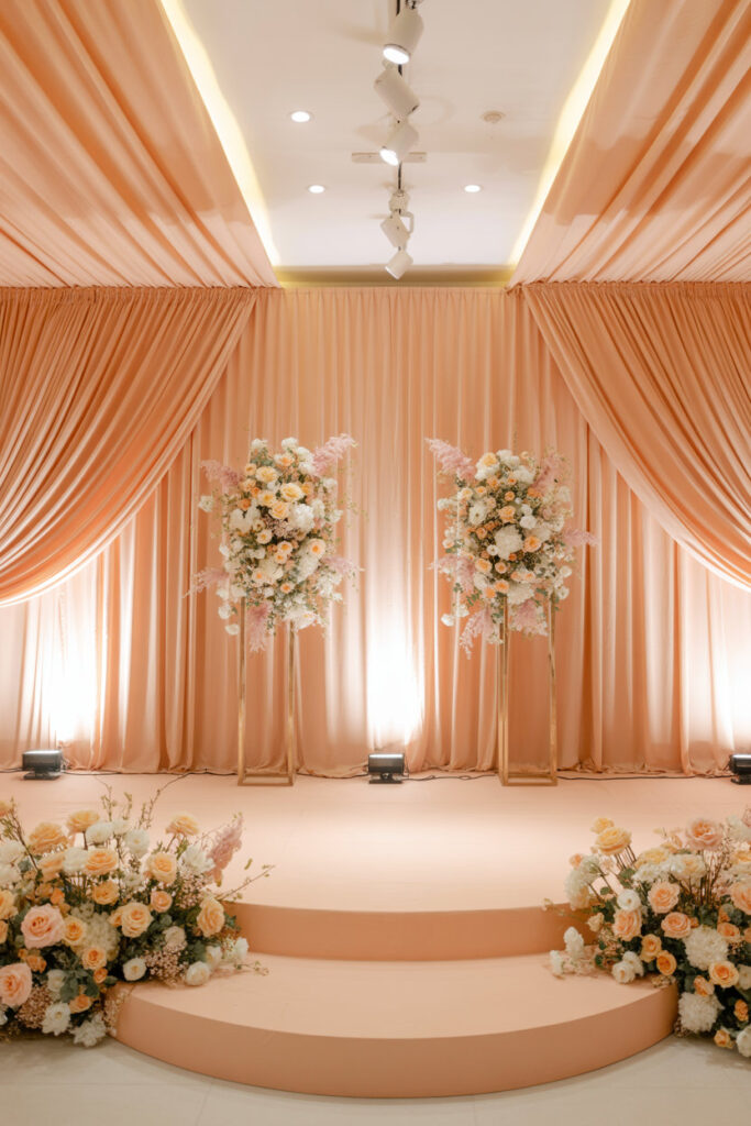 If you’re envisioning a ceremony that feels elegant, cohesive, and effortlessly luxurious, this peach-toned stage design is a stunning way to create a memorable and visually striking moment.