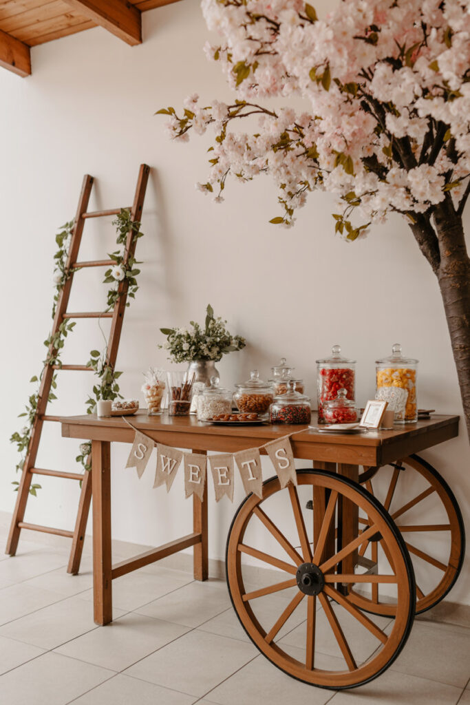 This setup is the perfect blend of charm and simplicity, creating a dessert station that feels warm, inviting, and effortlessly styled. The wooden cart adds a rustic foundation, bringing texture and character while keeping the overall look grounded and natural.
