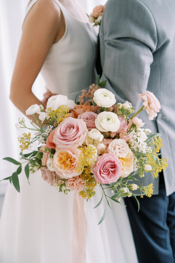 Overflowing with soft peach blooms, creamy ivory flowers, and delicate hints of blush, the arrangement feels lush without being overly polished. The mix of florals creates a natural, slightly undone look that leans into that effortless, organic style couples are gravitating toward.