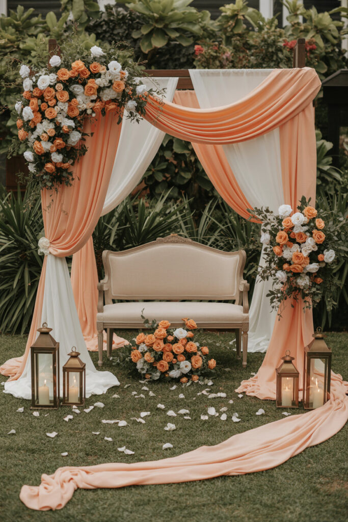 If you’re looking for a ceremony backdrop that feels soft, romantic, and photo-ready from every angle, this peach draped setup with lounge seating is an effortlessly beautiful choice.