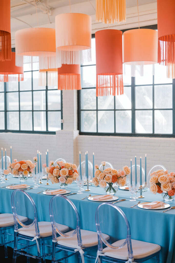 If you’re looking to push beyond classic palettes while still keeping things cohesive and beautiful, this peach and blue reception is a standout choice that feels stylish, creative, and completely on trend.