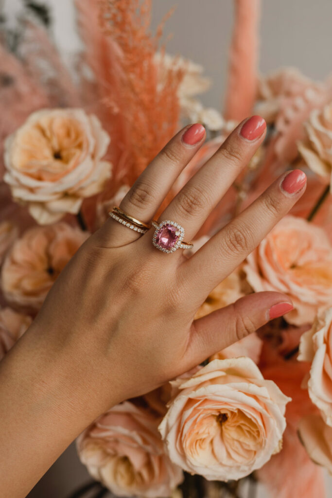 The ring design adds a romantic focal point, with a blush-toned center stone surrounded by delicate detailing that catches the light effortlessly. Paired with a minimal band, the look stays elegant and refined.