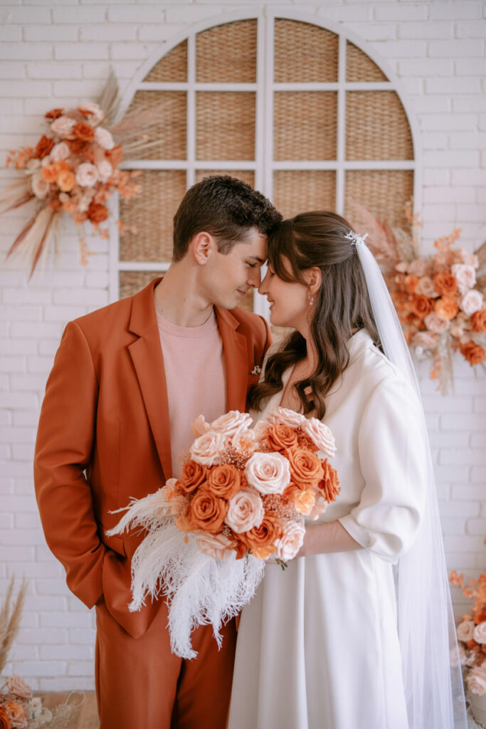 The groom’s warm terracotta suit adds depth and richness, perfectly balancing the softer peach and blush tones in the bride’s bouquet. It’s a fresh take on traditional wedding attire that feels stylish without being overdone.