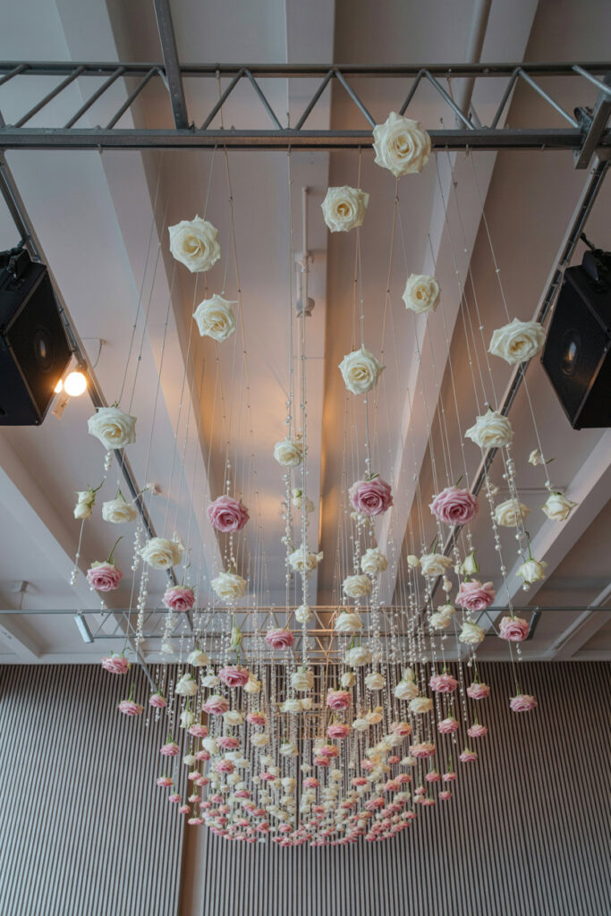 Each flower is delicately hung at varying heights, creating movement and depth that draws the eye upward. The mix of soft blush, peach, and creamy white tones keeps the palette light and elegant, while still adding enough contrast to feel visually striking.