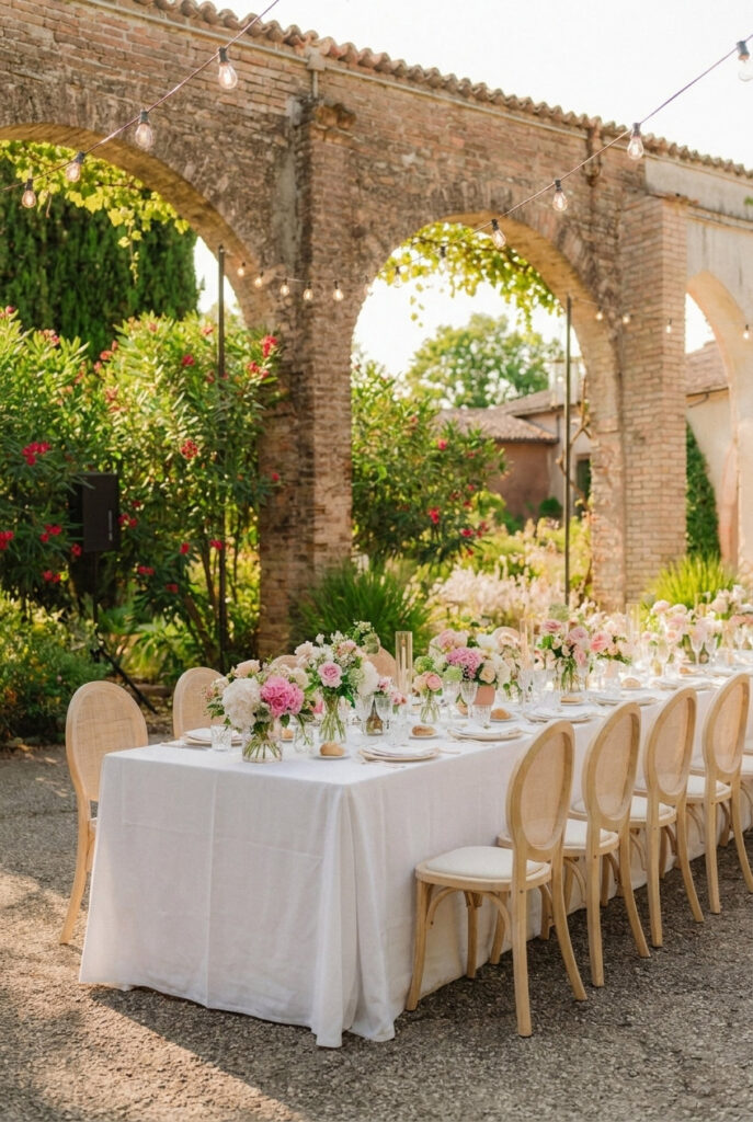 This setting feels straight out of a European garden dream—effortless, sun-soaked, and quietly romantic. The rustic stone arches create a stunning architectural backdrop, adding texture and character while framing the entire reception space beautifully.