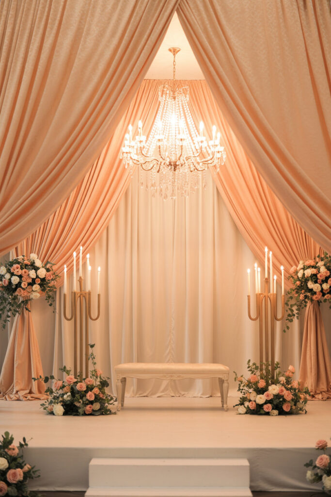 If you’re envisioning a wedding that feels grand, romantic, and timeless, this peach draped stage with chandelier lighting is the kind of design that creates a truly breathtaking moment.