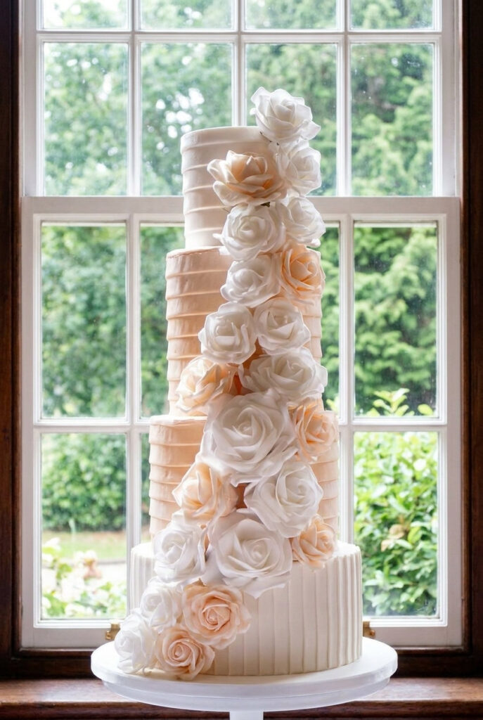 The cascading florals are the true focal point here. Oversized sugar roses in shades of ivory and blush-peach flow effortlessly down the cake, creating movement and a dramatic, eye-catching effect that feels luxurious without being overwhelming.