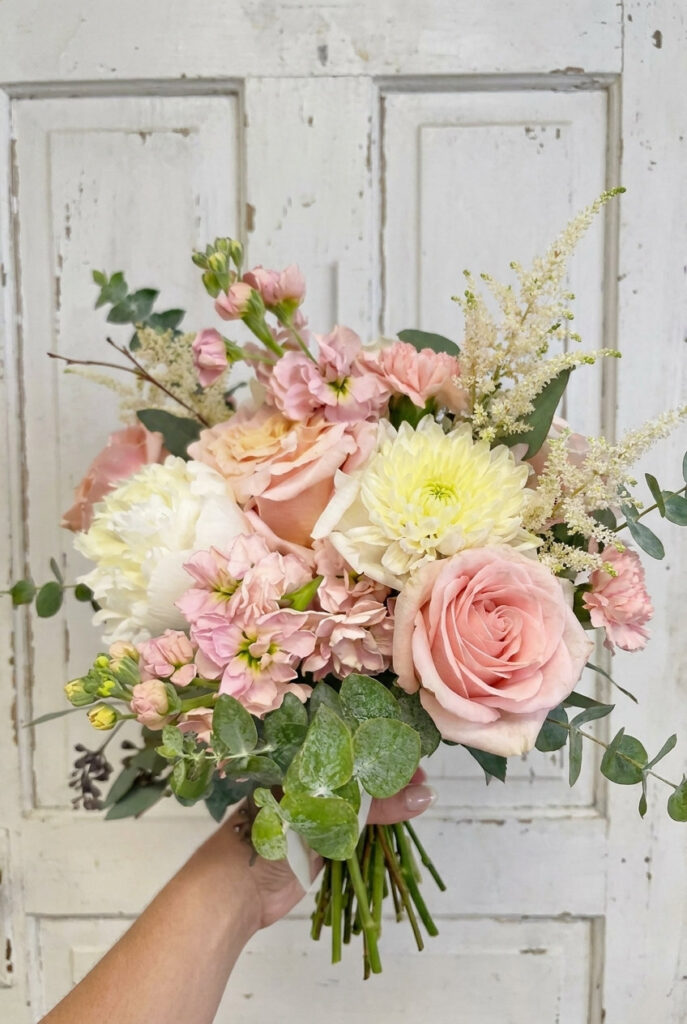 Touches of eucalyptus and greenery bring in a fresh, modern contrast, softening the pastel tones and adding depth. The slightly loose, hand-tied style enhances the overall look, making it feel approachable rather than overly polished.