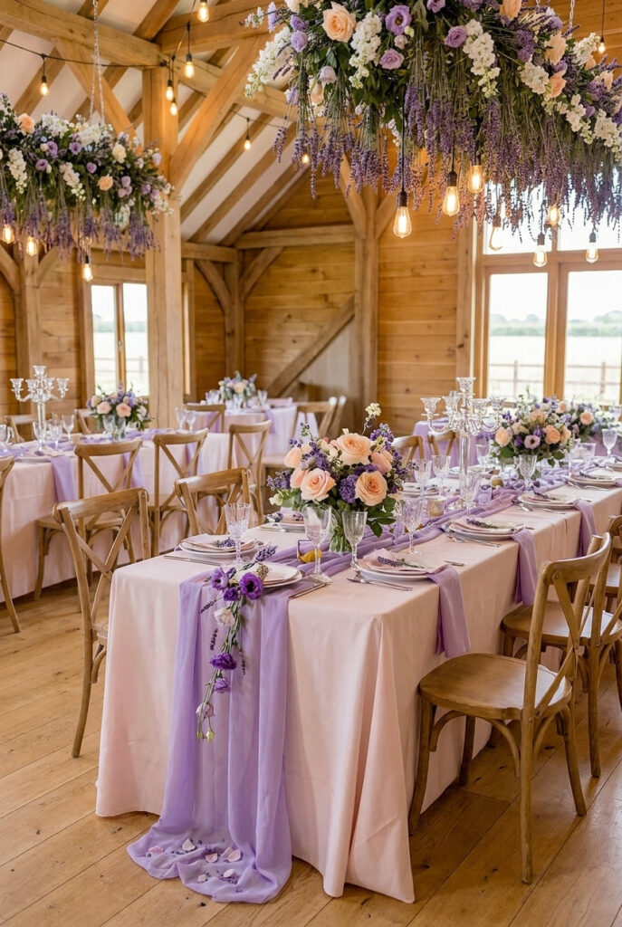 If you’re looking for a reception style that feels romantic, slightly whimsical, and full of personality, this peach and lavender combination is a standout choice that brings a fresh perspective to rustic wedding design.