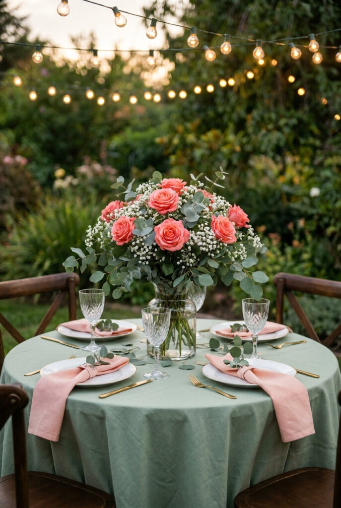 This setup feels like a dreamy outdoor dinner party—intimate, romantic, and effortlessly beautiful. The soft green table linen sets a fresh, natural foundation, allowing the peach accents to stand out in a way that feels vibrant without being overpowering.