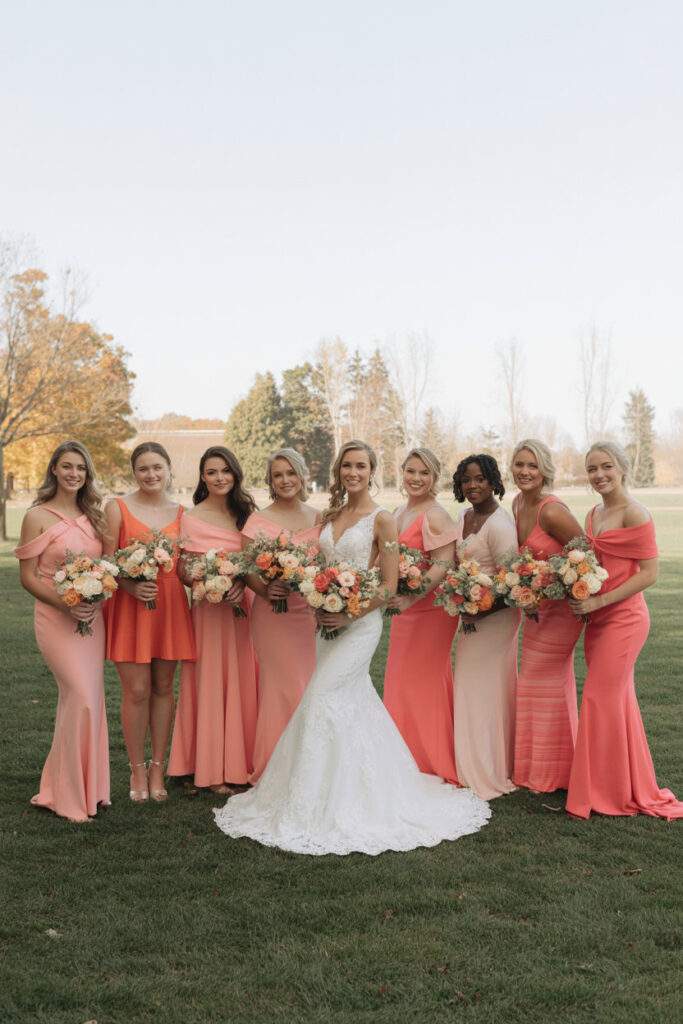 This bridal party look is the perfect example of how a cohesive color palette can create a stunning, photo-ready moment. A mix of peach, coral, and soft blush dresses adds depth and variation, while still feeling beautifully coordinated.