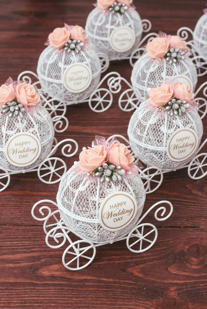 These wedding favors are the definition of charming, delicate, and completely unforgettable. Designed in a whimsical mini carriage style, they instantly add a fairytale-inspired touch while still feeling elegant and cohesive with a peach wedding theme.