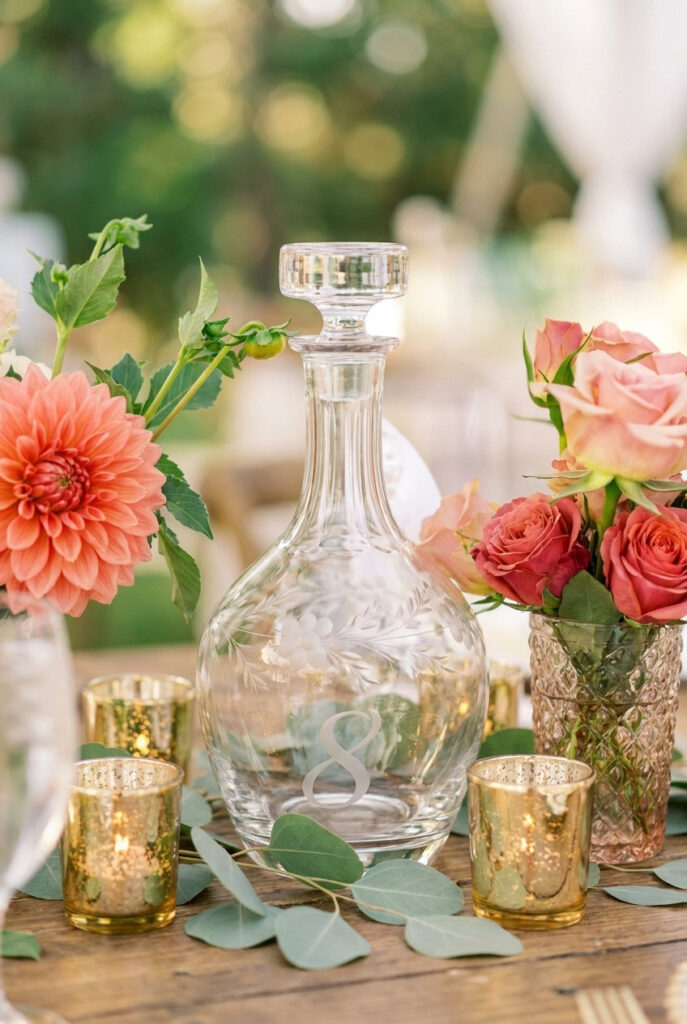 This tablescape is the perfect mix of romantic detail and personalized elegance. At the center, a beautifully etched glass decanter adds a custom touch that feels both meaningful and refined, instantly elevating the entire setup.