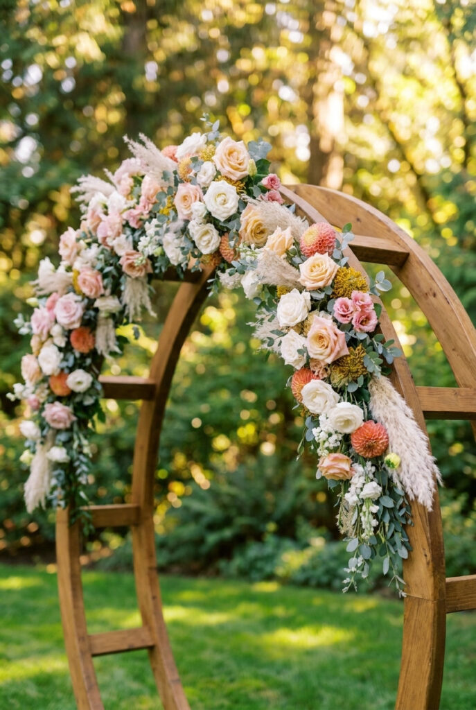 Romantic Peach Floral Arch with Rustic Wood Frame