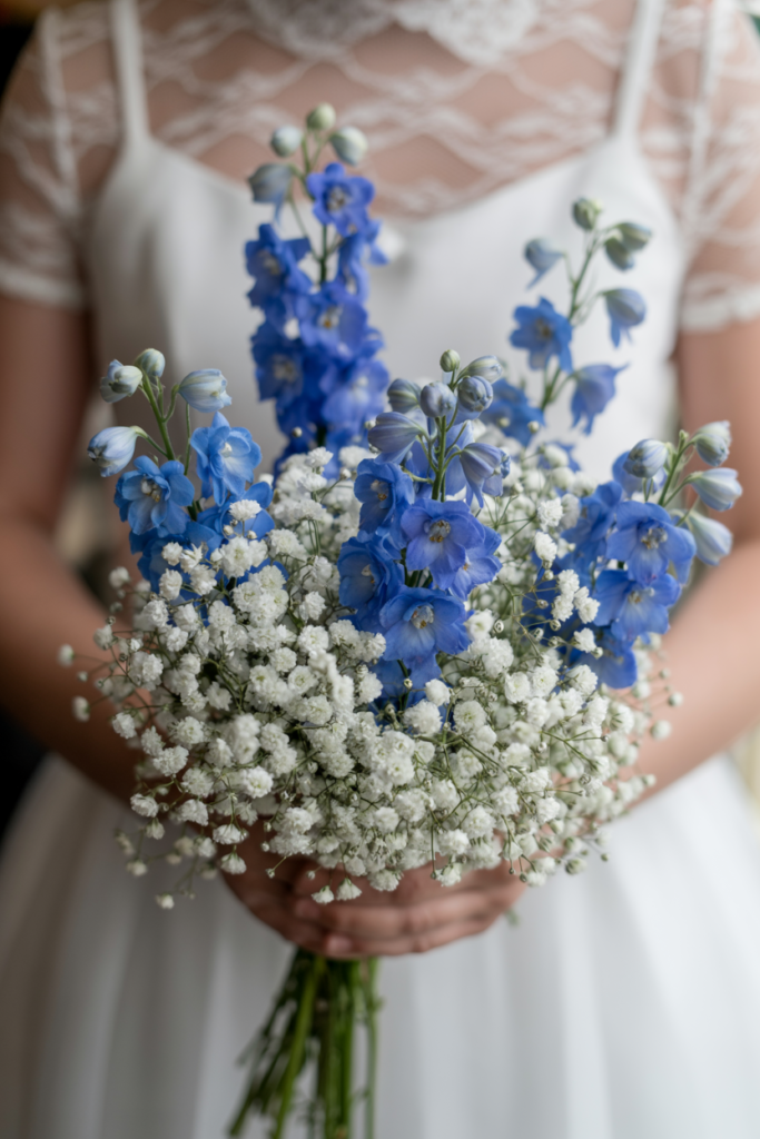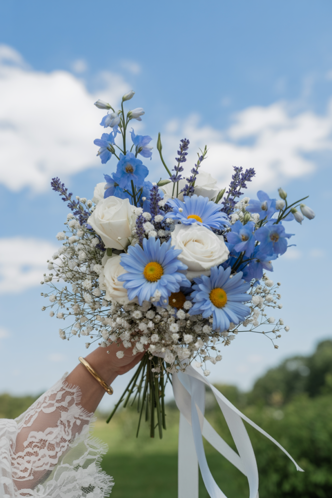 The bright blue tones against crisp white blooms give this bouquet a joyful, countryside-inspired feel that’s perfect for spring or outdoor weddings.