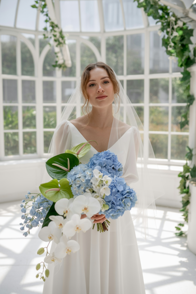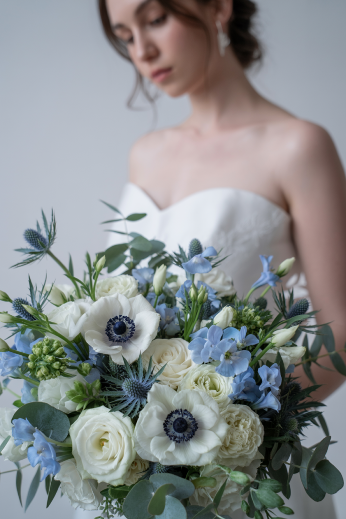Soft white blooms such as garden roses, ranunculus, and peonies create a cloud-like base, while shades of dusty blue, cornflower, or deep navy add quiet depth and contrast. The result is a bouquet that feels polished yet organic, equally at home in a breezy garden ceremony, a coastal celebration, or a classic ballroom wedding.