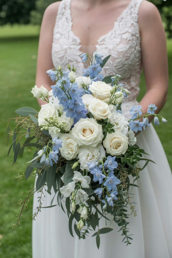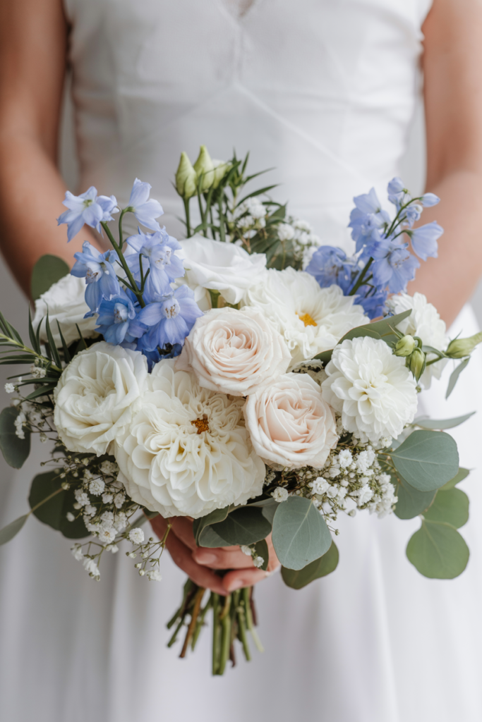 This blue and white wedding bouquet feels effortlessly romantic, blending soft ivory roses, delicate white dahlias, and airy sprigs of pale blue delphinium for a look that is both classic and fresh.