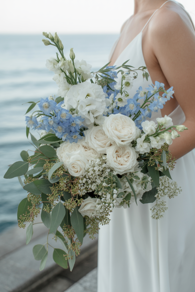 This airy blue and white bouquet feels perfectly at home beside the sea, blending creamy white roses with soft blue delphinium, delicate filler flowers, and flowing greenery for a naturally romantic look.