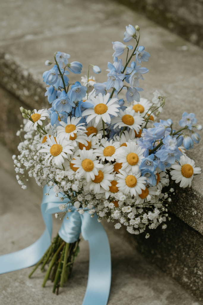 This charming wildflower bouquet pairs cheerful white daisies with soft blue delphinium and delicate baby’s breath for a naturally relaxed, countryside-inspired look. The bright yellow daisy centers add a touch of warmth while the pale blue ribbon ties the palette together beautifully. Perfect for outdoor, garden, or rustic weddings, this bouquet captures the effortless charm of seasonal blooms. For more inspiration, explore these beautiful wildflower bouquet ideas for weddings.