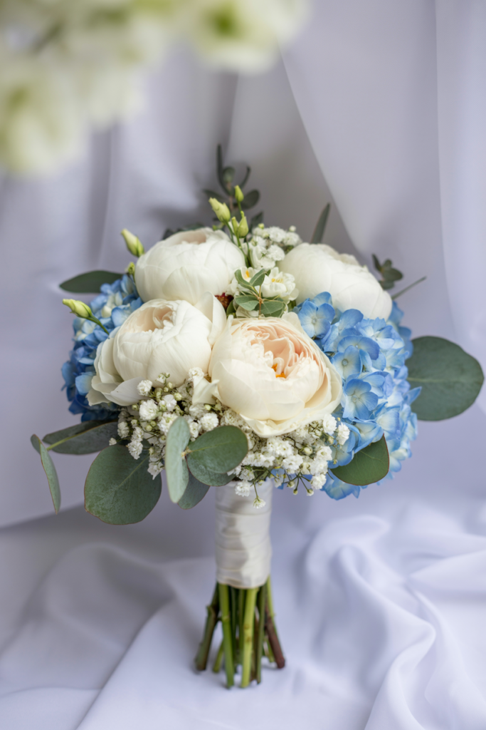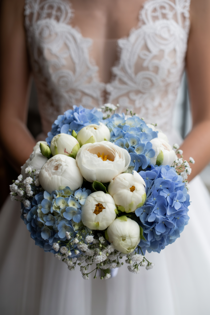 Blue Hydrangea and White Peony Wedding Bouquet