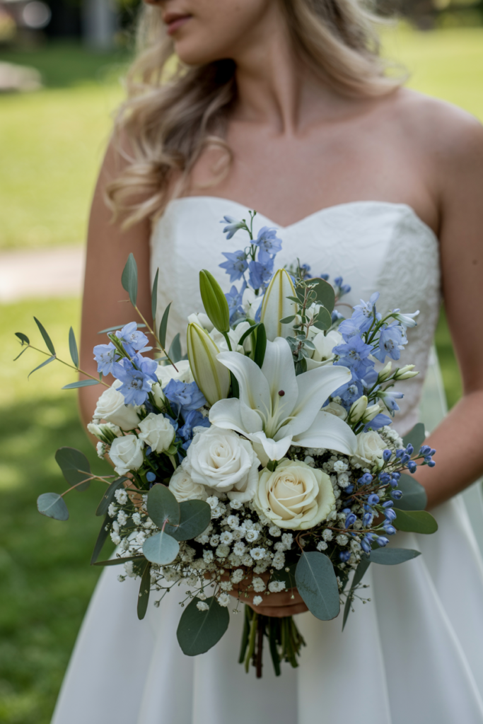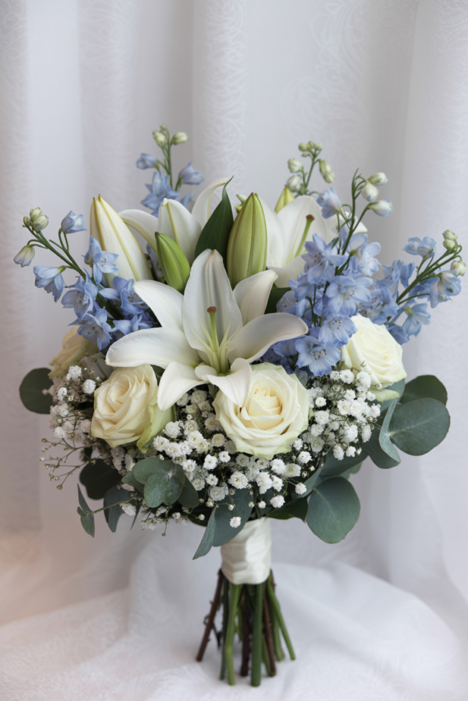 This elegant bouquet combines classic white lilies with soft blue delphinium, creamy roses, and delicate baby’s breath for a timeless spring arrangement. The mix of structured lilies and airy filler flowers creates a balanced look that feels both polished and romantic. Soft greenery adds texture while keeping the palette light and fresh—perfect for a spring ceremony. For more seasonal inspiration, explore these beautiful fresh April wedding flowers to discover blooms that pair perfectly with a blue and white wedding palette.