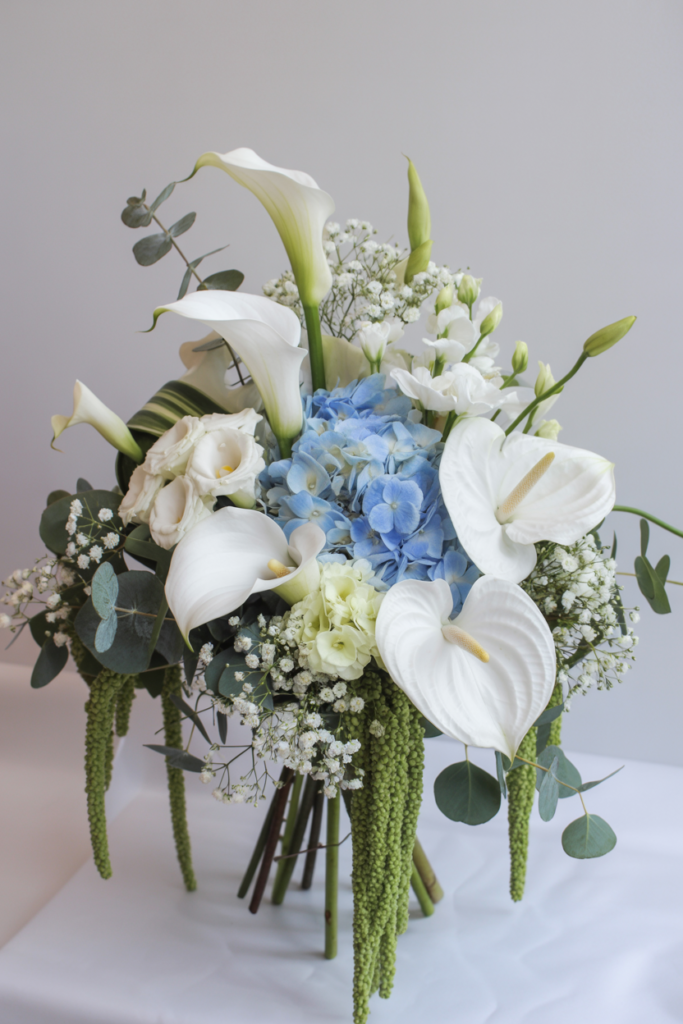 This sophisticated blue and white bouquet blends soft blue hydrangeas with graceful white calla lilies, anthuriums, and delicate baby’s breath for a modern yet timeless floral design. Cascading green amaranthus and eucalyptus add texture and movement, giving the arrangement a luxurious, garden-inspired feel.