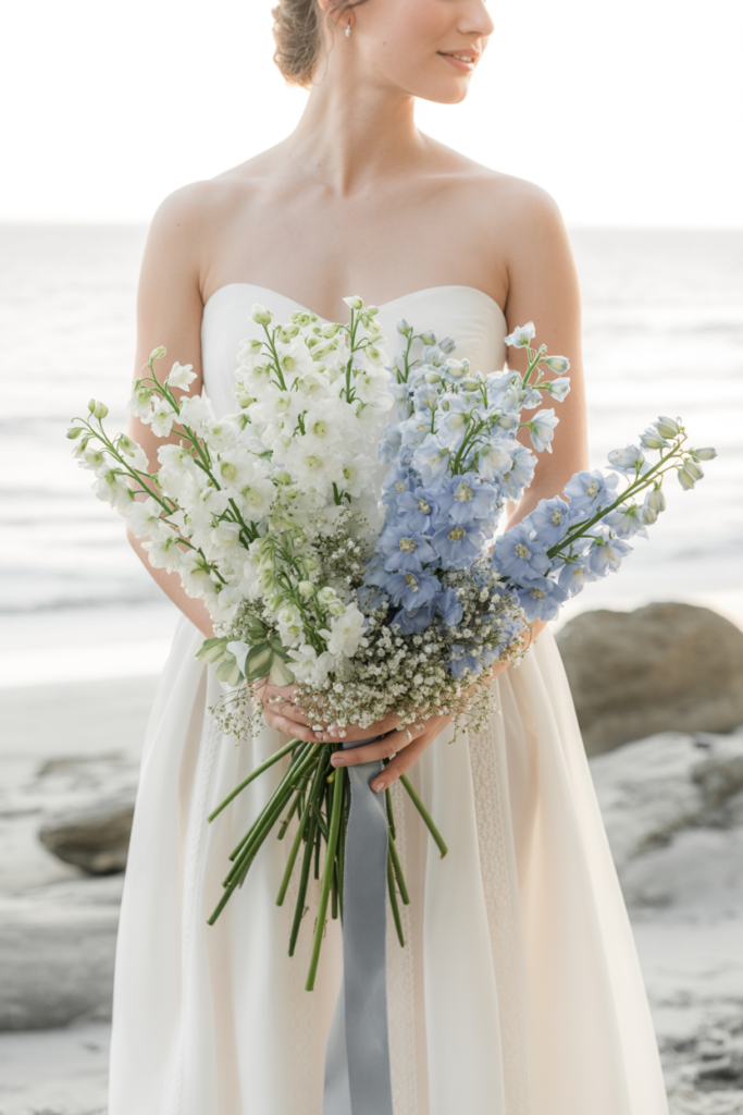 This airy bouquet of pale blue delphinium creates a graceful, flowing arrangement that feels perfectly suited for a seaside wedding. The long stems and delicate blossoms give the bouquet a natural, windswept shape while the soft blue tones add a calm, romantic touch against a classic white gown. With its loose structure and light texture, this bouquet captures the effortless beauty of coastal celebrations and garden-inspired bridal style.