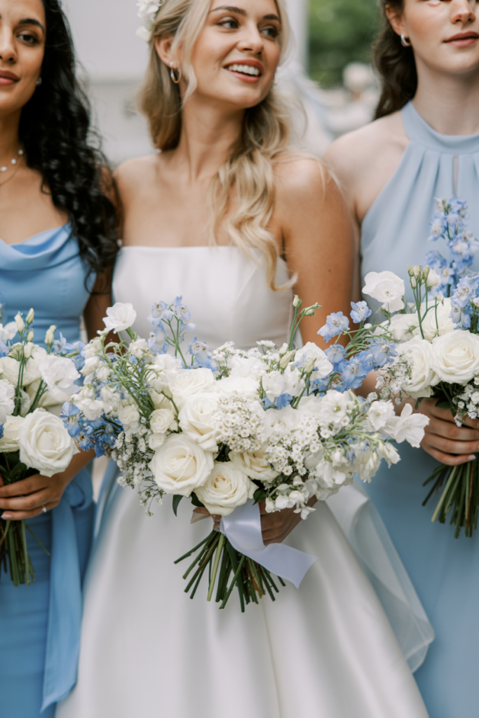 Perfect for spring or early summer celebrations, this palette feels fresh, refined, and beautifully bridal. For more seasonal inspiration, explore these May wedding flower ideas to discover blooms that complement this soft blue and white color scheme.